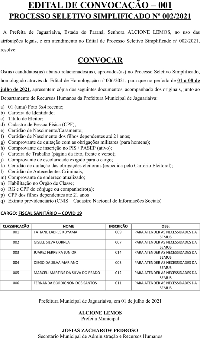 Edital de Convocação 001 – Processo Seletivo Simplificado 002/2021