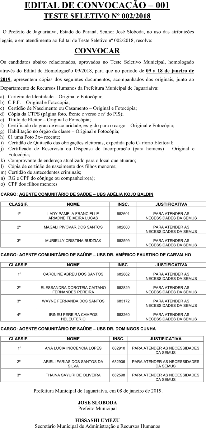 Edital de Convocação 001 – Teste Seletivo 002/2018