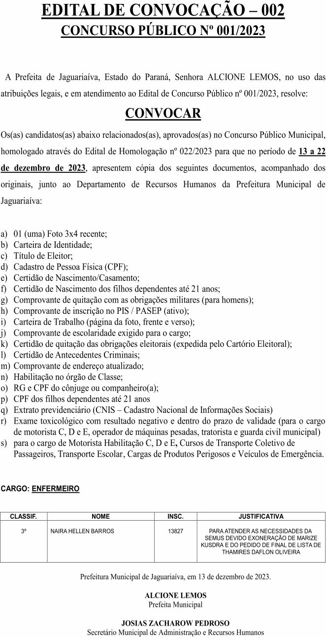 Edital de Convocação 002 – Concurso Público 001/2023