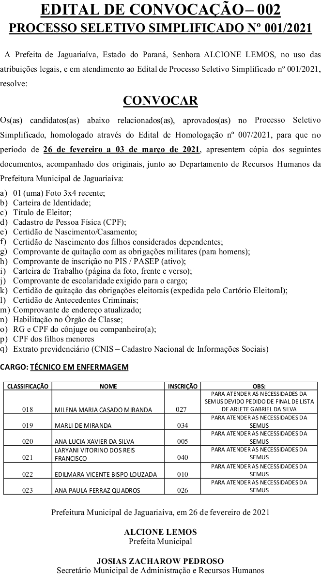 Edital de Convocação 002 – Processo Seletivo Simplificado 001/2021