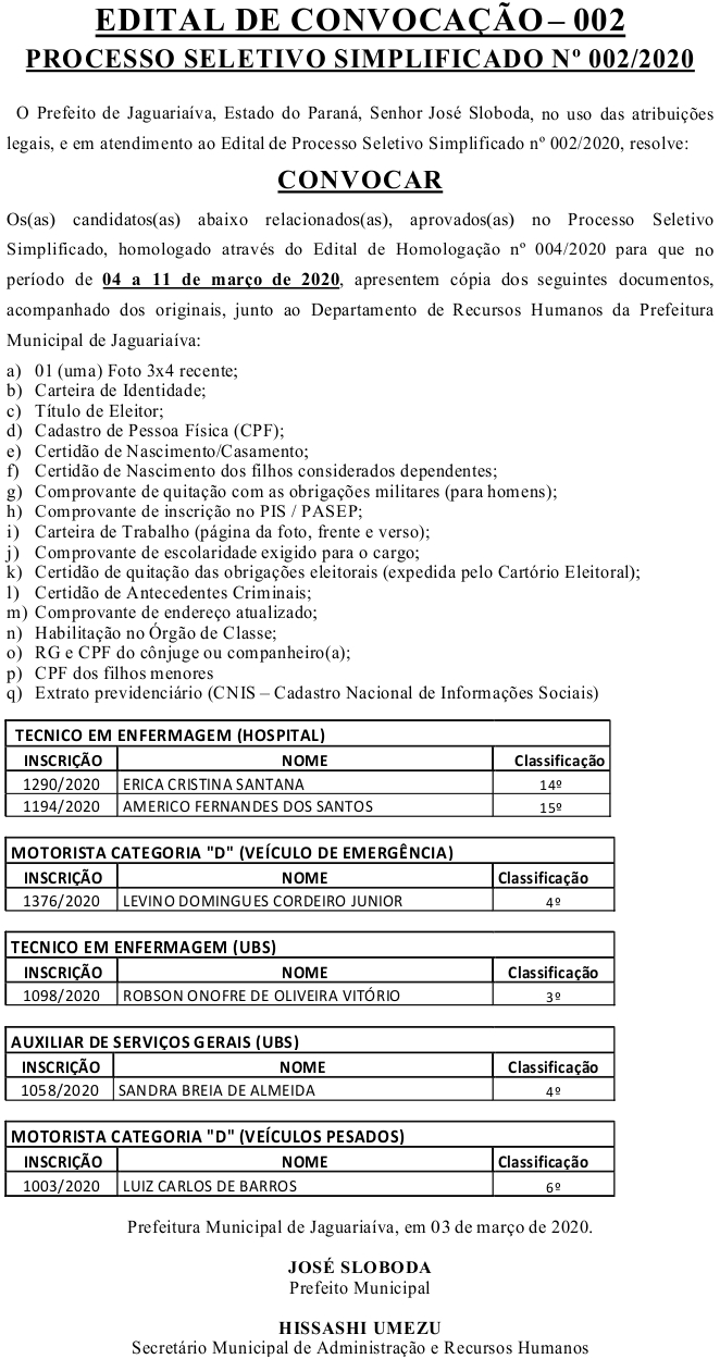 Edital de Convocação 002 – Processo Seletivo Simplificado 002/2020