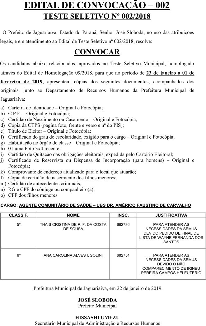 Edital de Convocação 002 – Teste Seletivo 002/2018