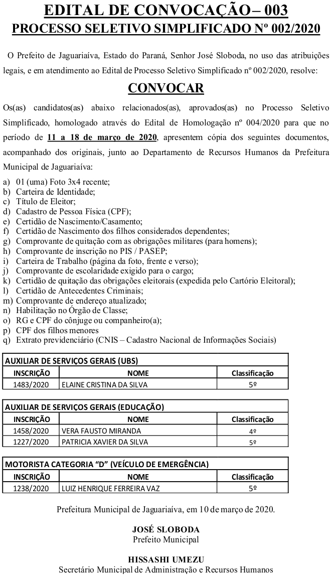 Edital de Convocação 003 – Processo Seletivo Simplificado 002/2020