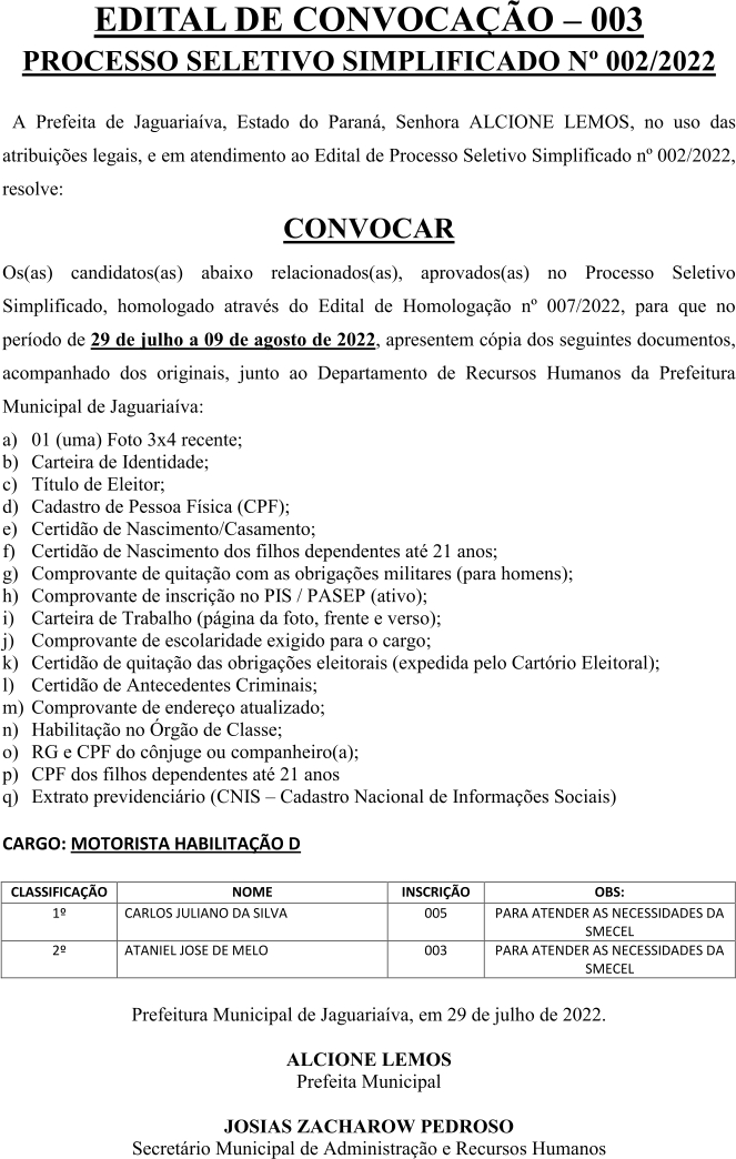 Edital de Convocação 003 – Processo Seletivo Simplificado 002/2022