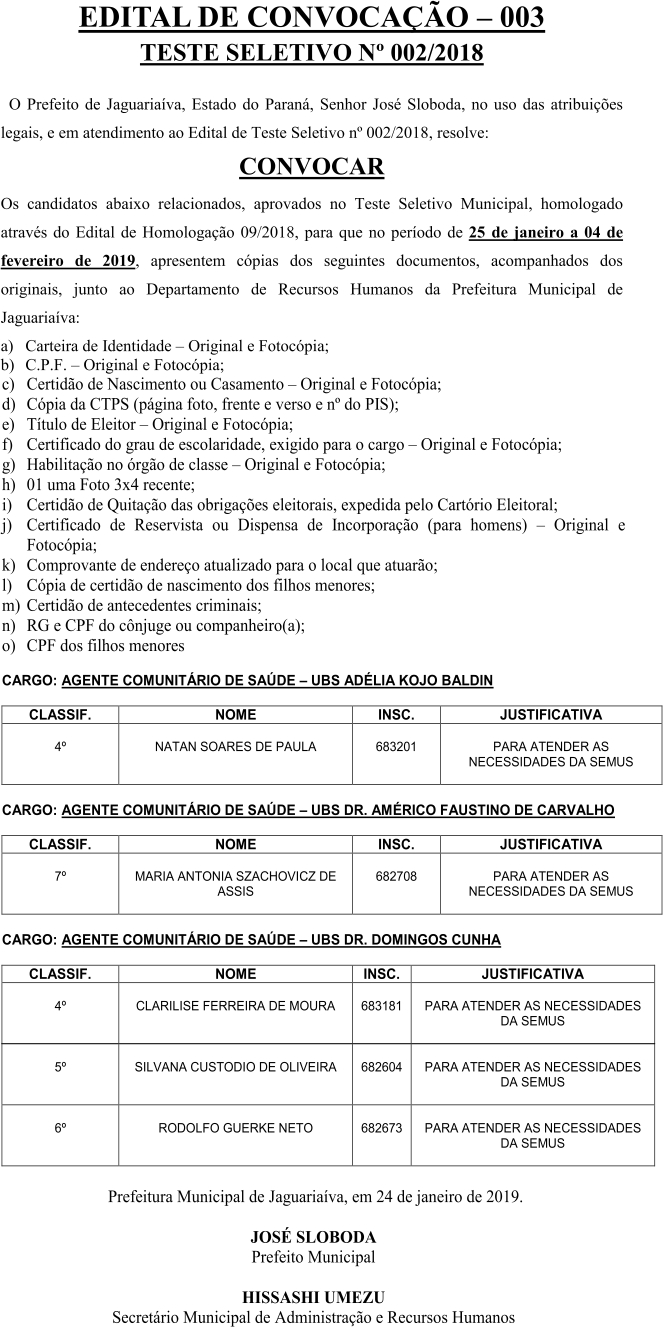 Edital de Convocação 003 – Teste Seletivo 002/2018