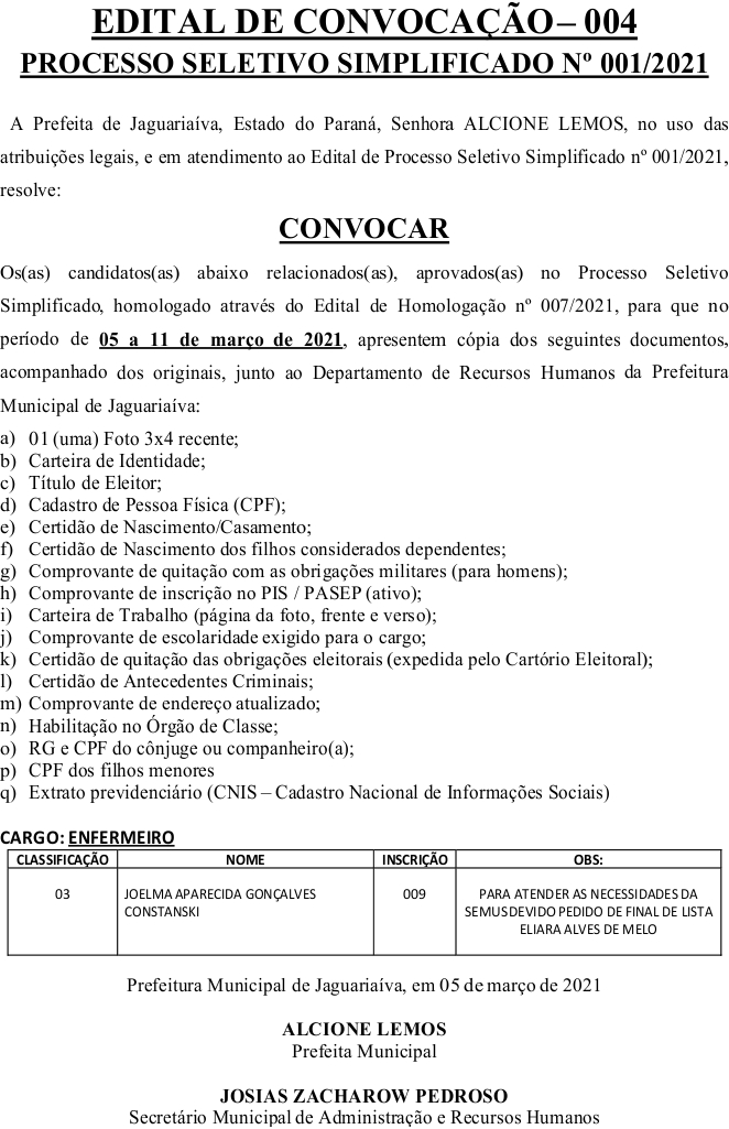 Edital de Convocação 004 – Processo Seletivo Simplificado 001/2021