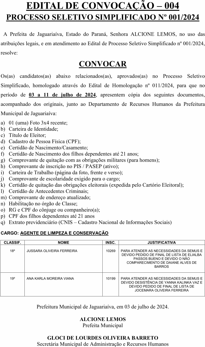Edital de Convocação 004 – Processo Seletivo Simplificado 001/2024