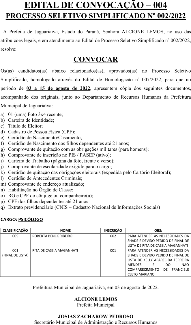 Edital de Convocação 004 – Processo Seletivo Simplificado 002/2022