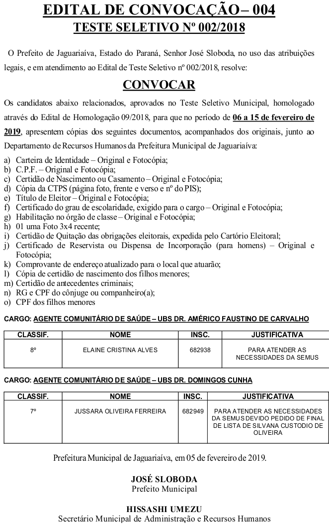 Edital de Convocação 004 – Teste Seletivo 002/2018