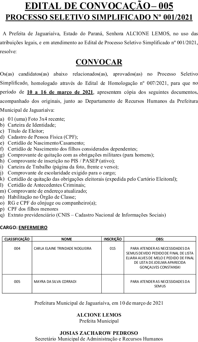 Edital de Convocação 005 – Processo Seletivo Simplificado 001/2021