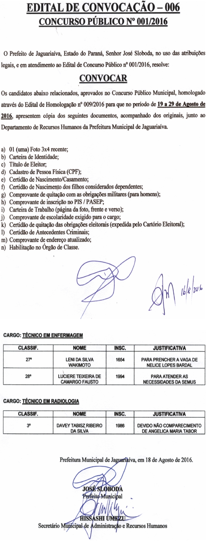 Edital de Convocação 006 – Concurso Público 001/2016