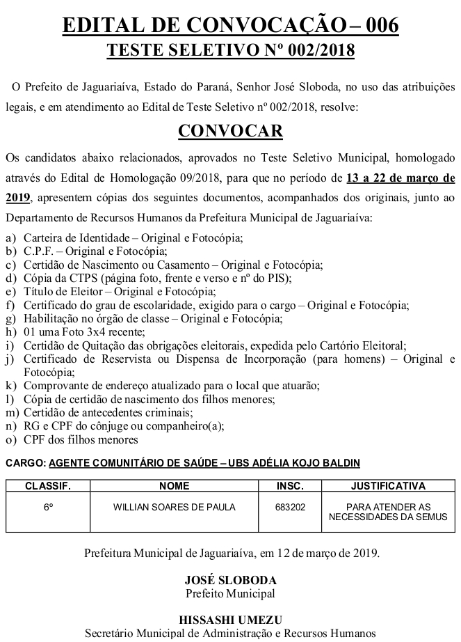 Edital de Convocação 006 – Teste Seletivo 002/2018