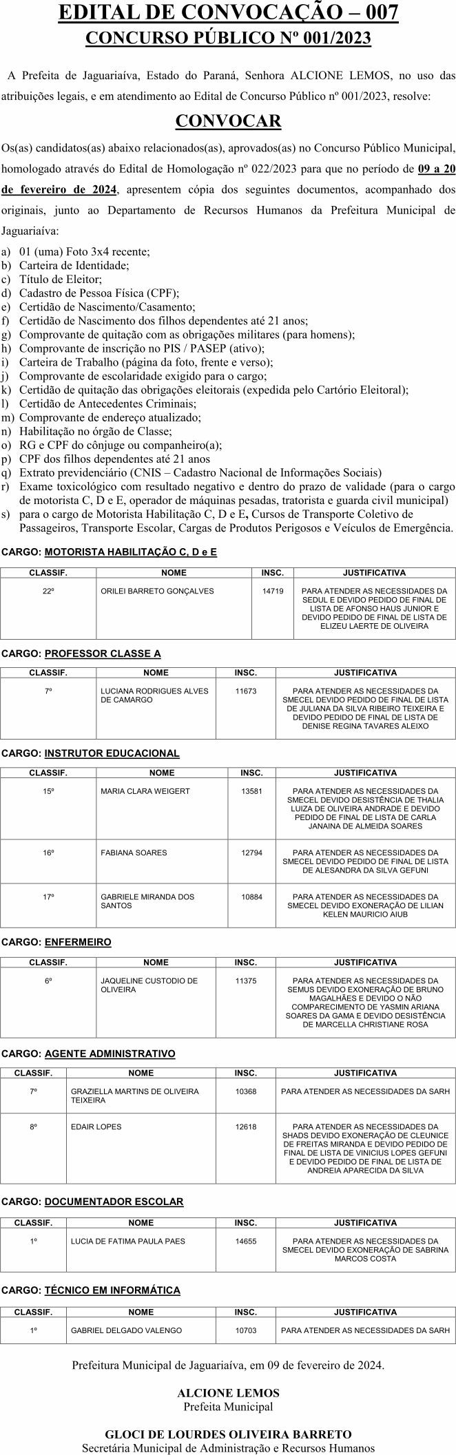 Edital de Convocação 007 – Concurso Público 001/2023