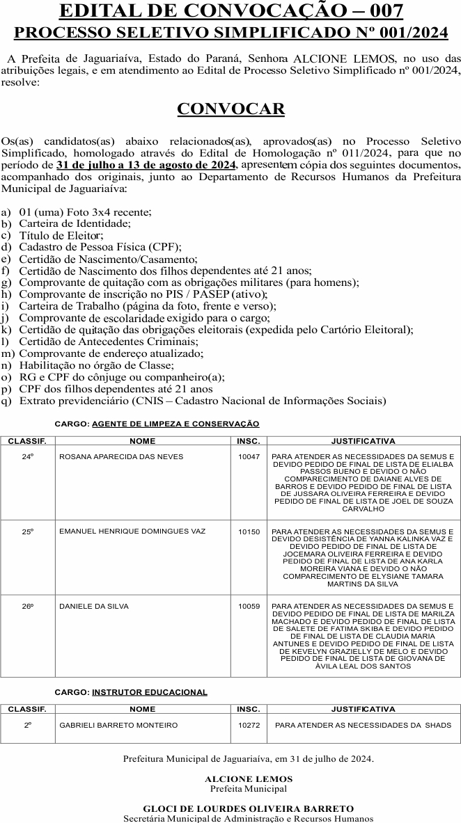 Edital de Convocação 007 – Processo Seletivo Simplificado 001/2024