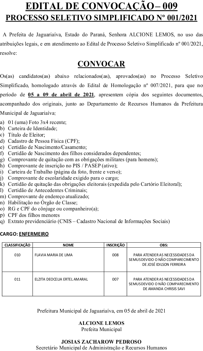 Edital de Convocação 009 – Processo Seletivo Simplificado 001/2021