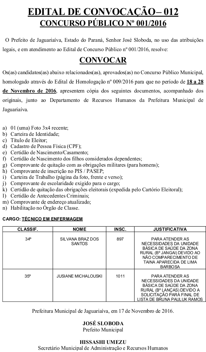 Edital de Convocação 012 – Concurso Público 001/2016