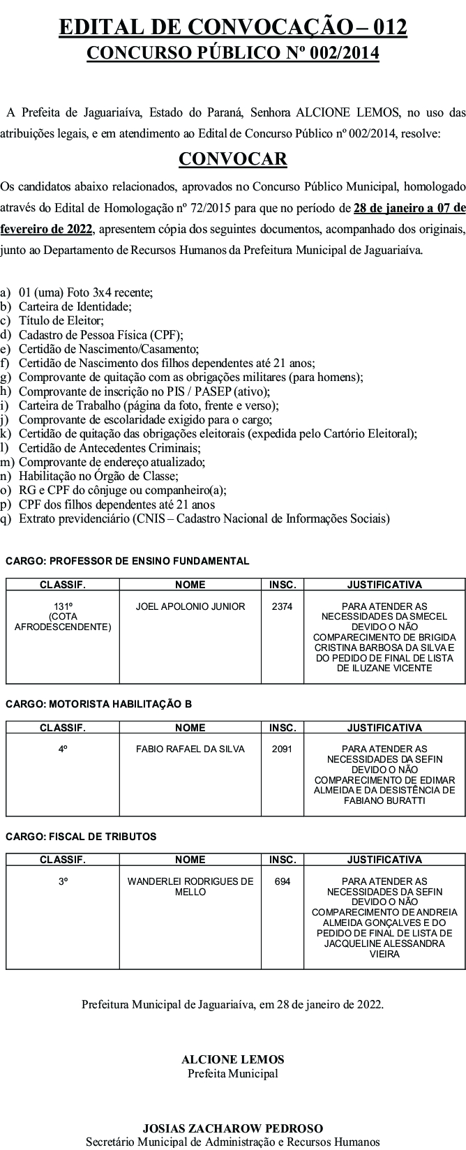 Edital de Convocação 012 – Concurso Público 002/2014