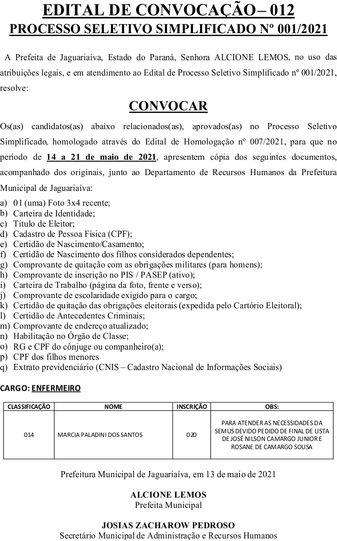Edital de Convocação 012 – Processo Seletivo Simplificado 001/2021