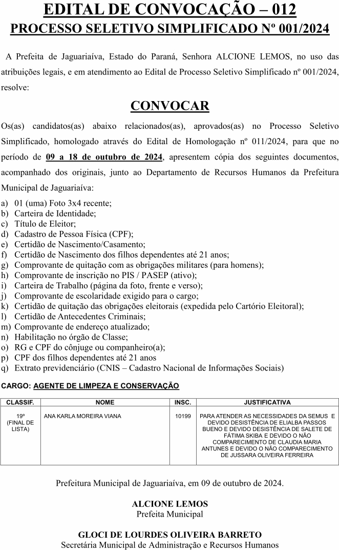Edital de Convocação 012 – Processo Seletivo Simplificado 001/2024