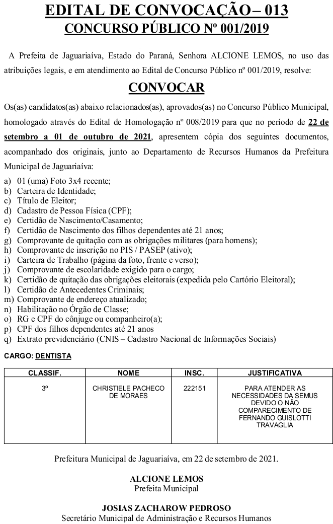 Edital de Convocação 013 – Concurso Público 001/2019