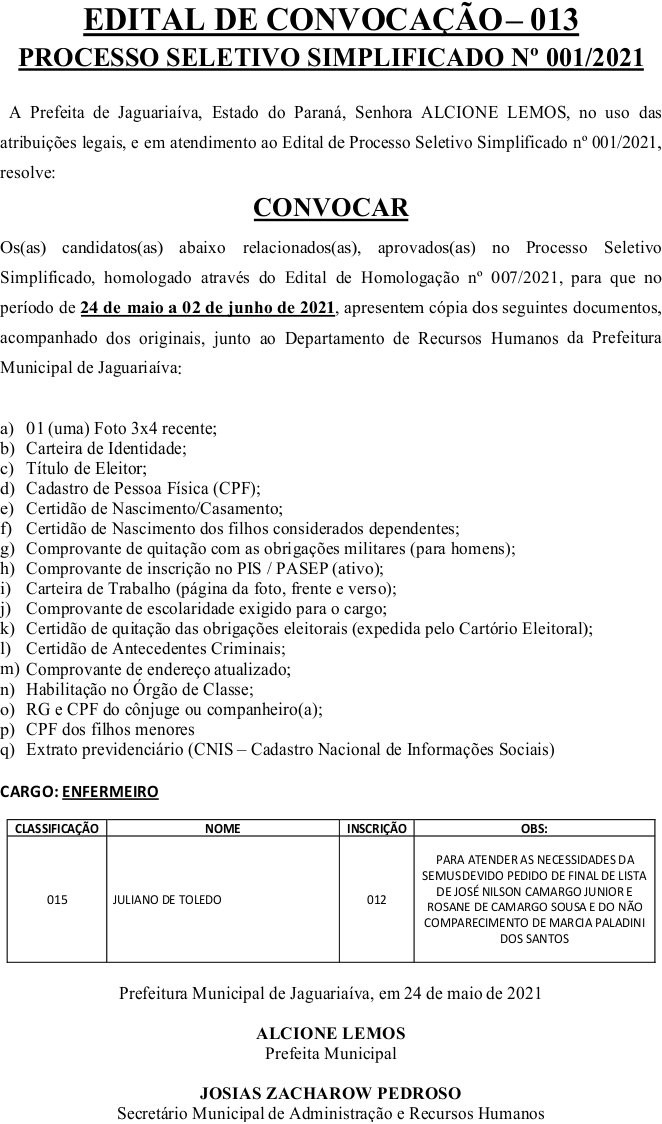 Edital de Convocação 013 – Processo Seletivo Simplificado 001/2021