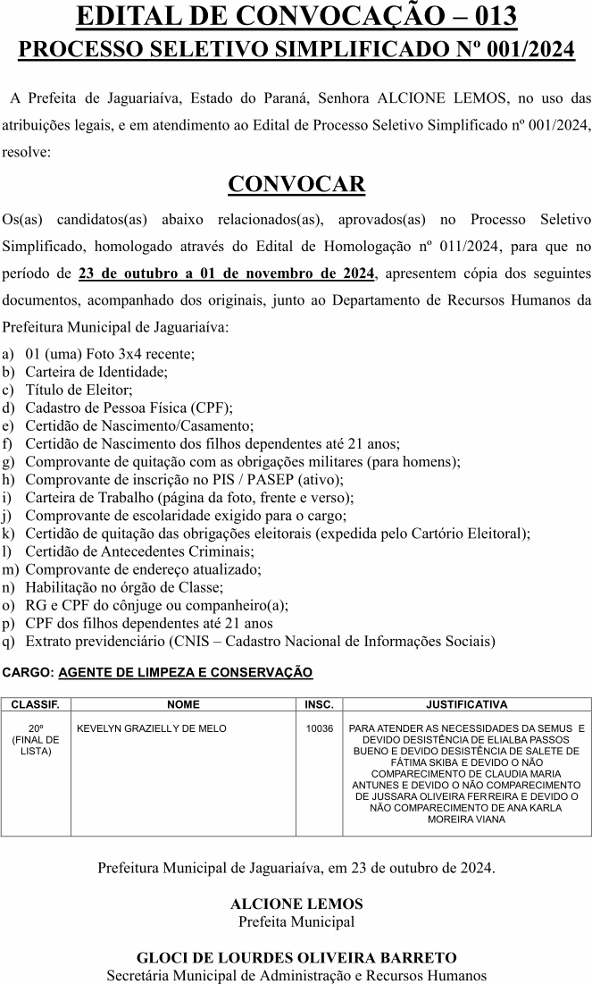 Edital de Convocação 013 – Processo Seletivo Simplificado 001/2024
