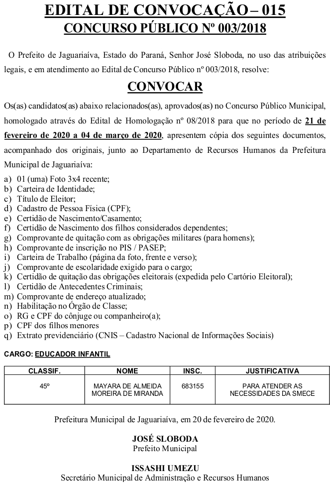 Edital de Convocação 015 – Concurso Público 003/2018