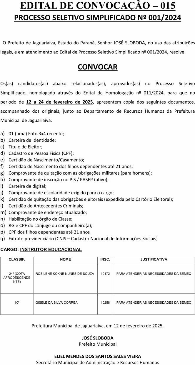Edital de Convocação 015 – Processo Seletivo Simplificado 001/2024