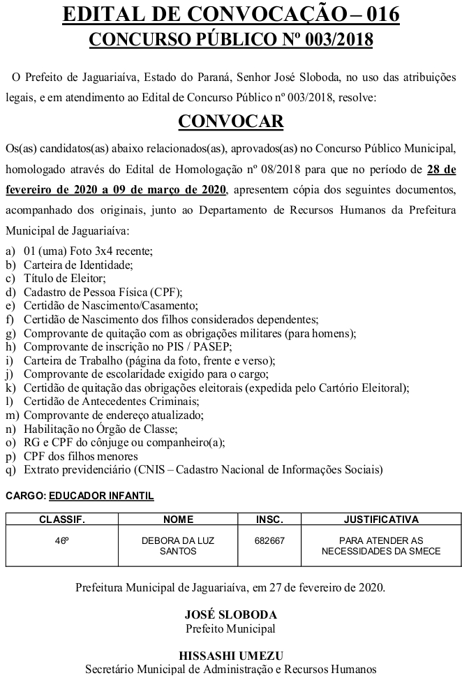 Edital de Convocação 016 – Concurso Público 003/2018