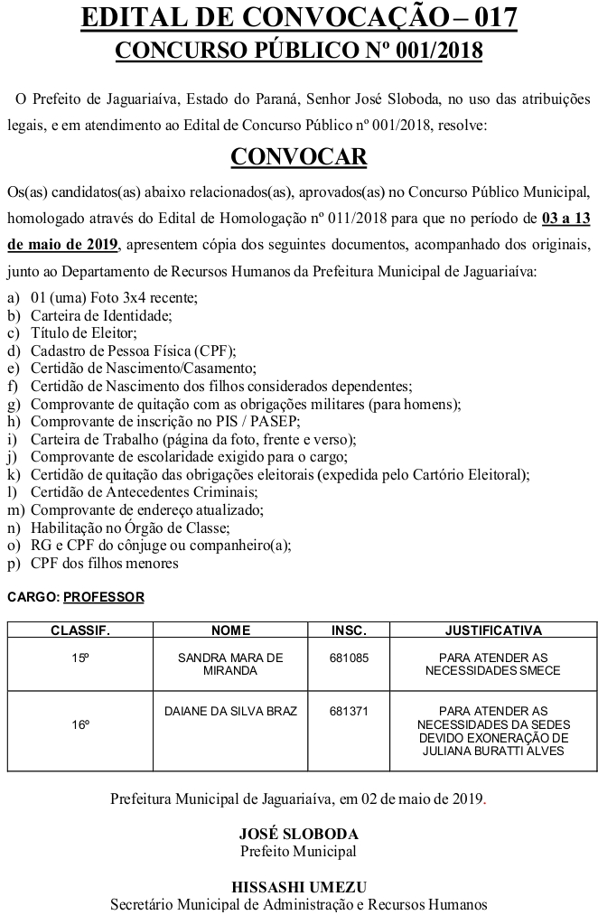 Edital de Convocação 017 – Concurso Público 001/2018