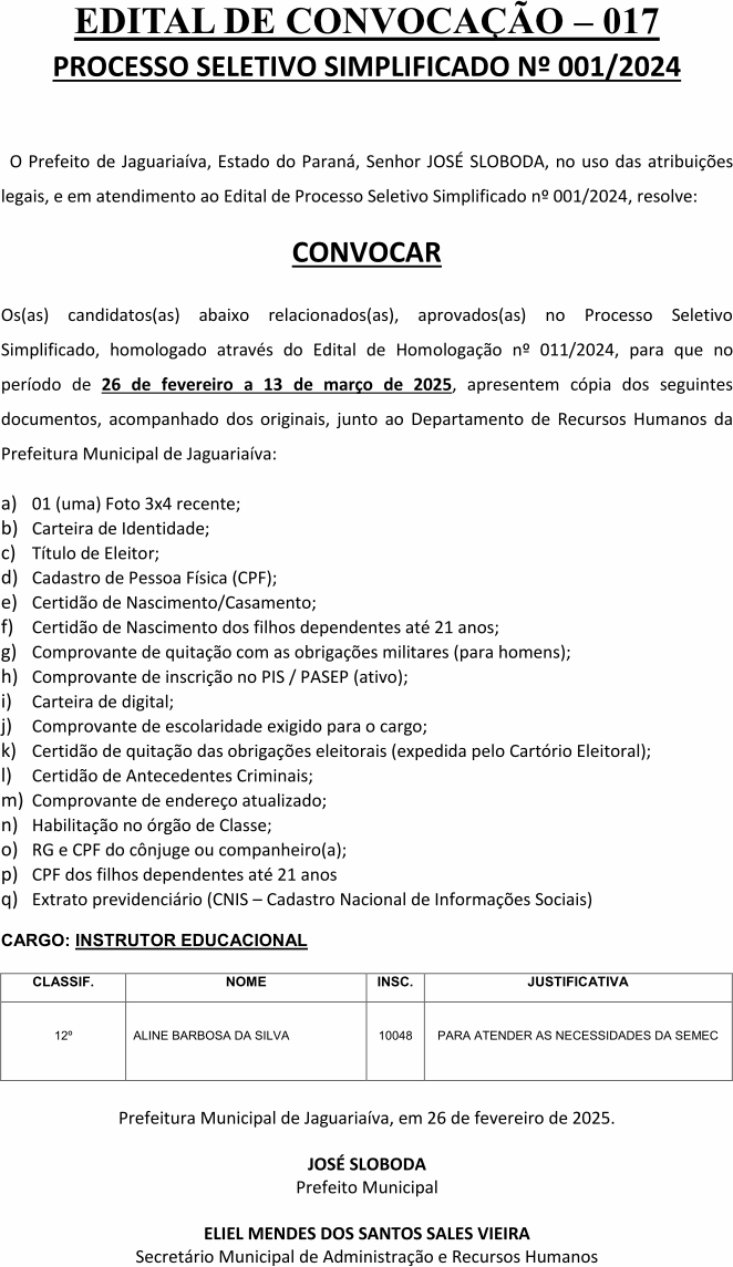 Edital de Convocação 017 – Processo Seletivo Simplificado 001/2024