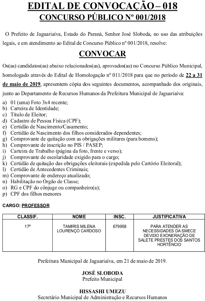 Edital de Convocação 018 – Concurso Público 001/2018