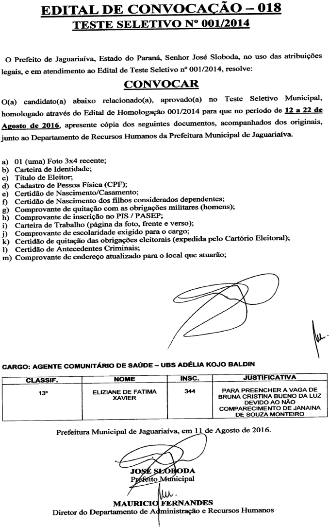 Edital de Convocação 018 – Teste Seletivo Nº 001/2014