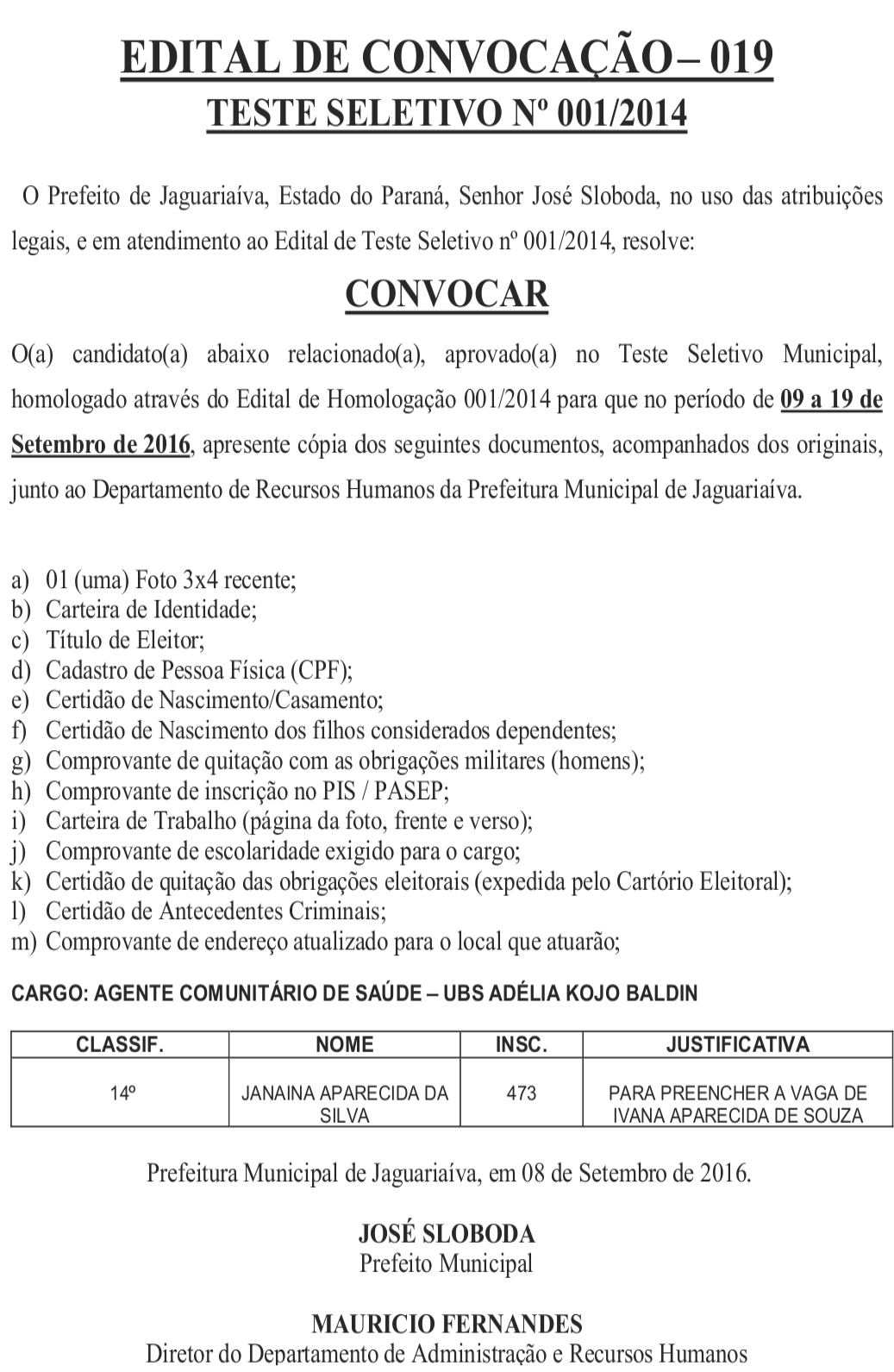 Edital de Convocação 019 – Teste Seletivo Nº 001/2014