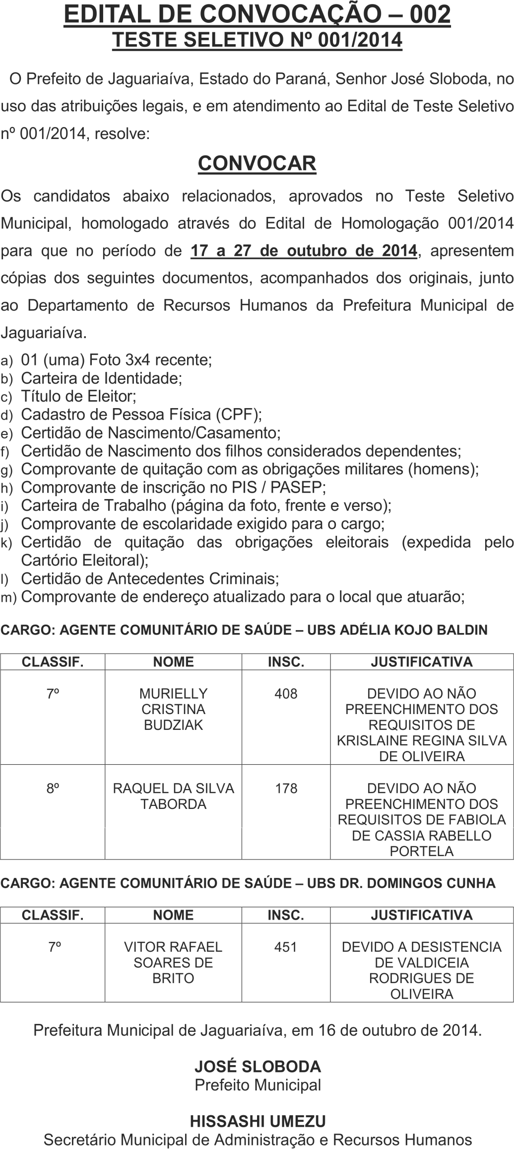 Edital de Convocação 02 – Teste Seletivo N° 001/2014