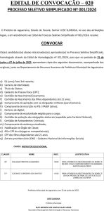 Edital de Convocação 020 – Processo Seletivo Simplificado 001/2024