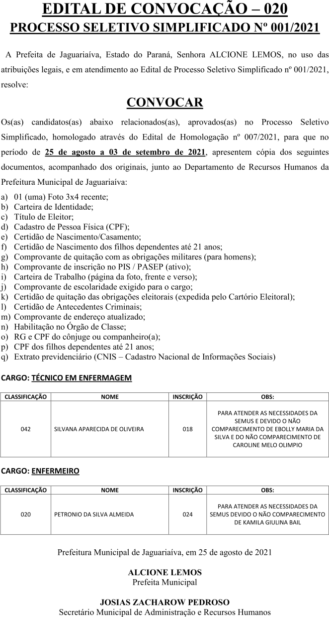 Edital de Convocação 020 – Processo Seletivo Simplificado 001/2021