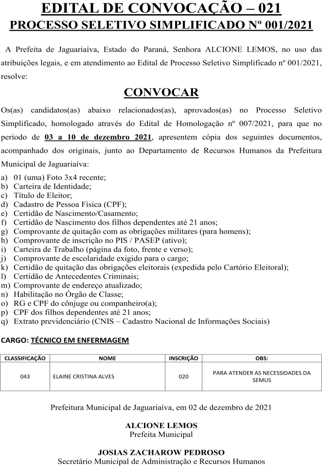 Edital de Convocação 021 – Processo Seletivo Simplificado 001/2021