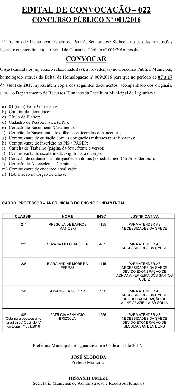 Edital de Convocação 022 – Concurso Público Nº 001/2016