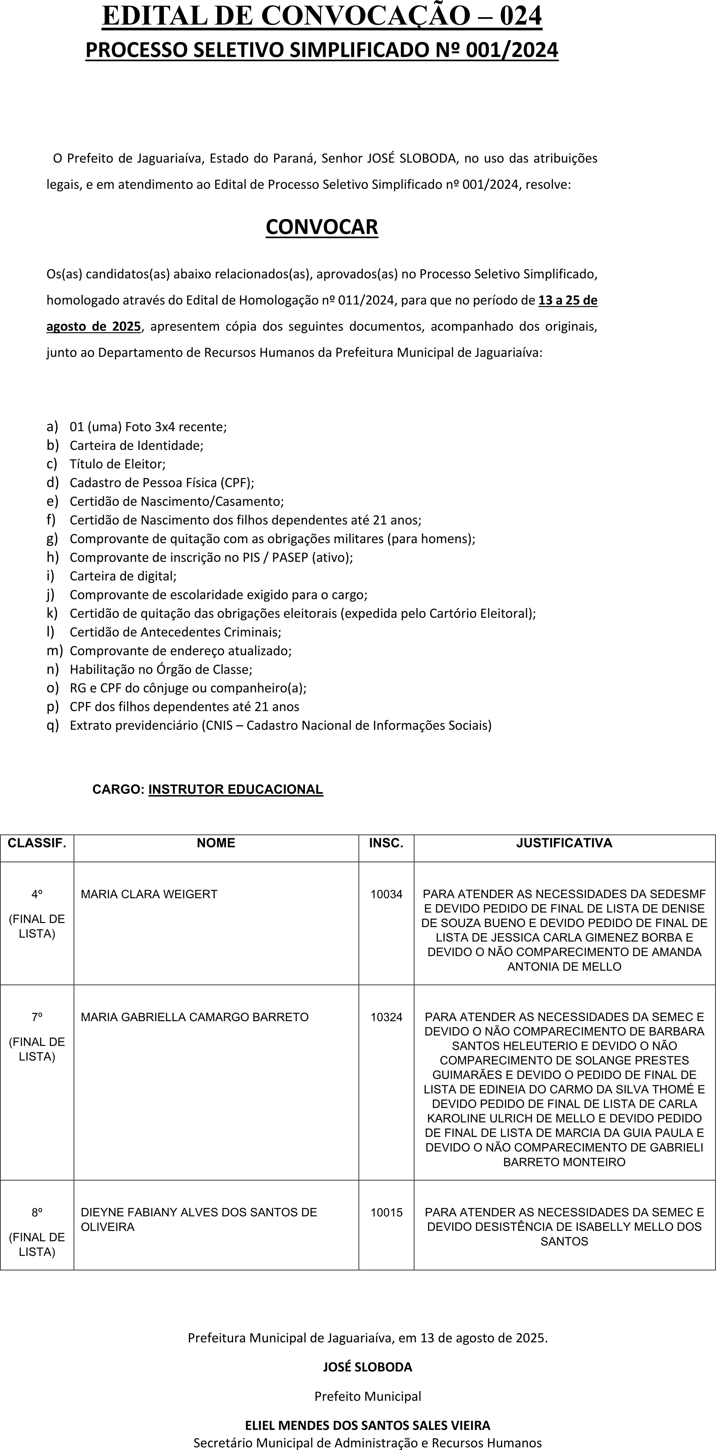Edital de Convocação 024 – Processo Seletivo Simplificado 001/2024