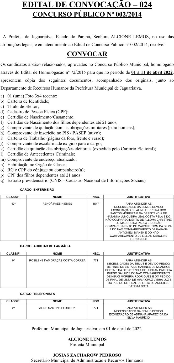 Edital de Convocação 024 – Concurso Público 002/2014