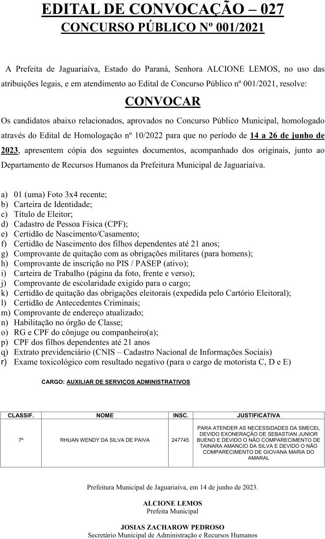 Edital de Convocação 027 – Concurso Público 001/2021