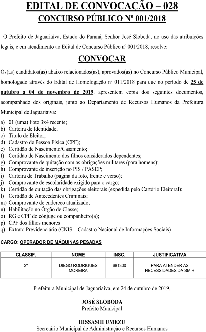 Edital de Convocação 028 – Concurso Público 001/2018