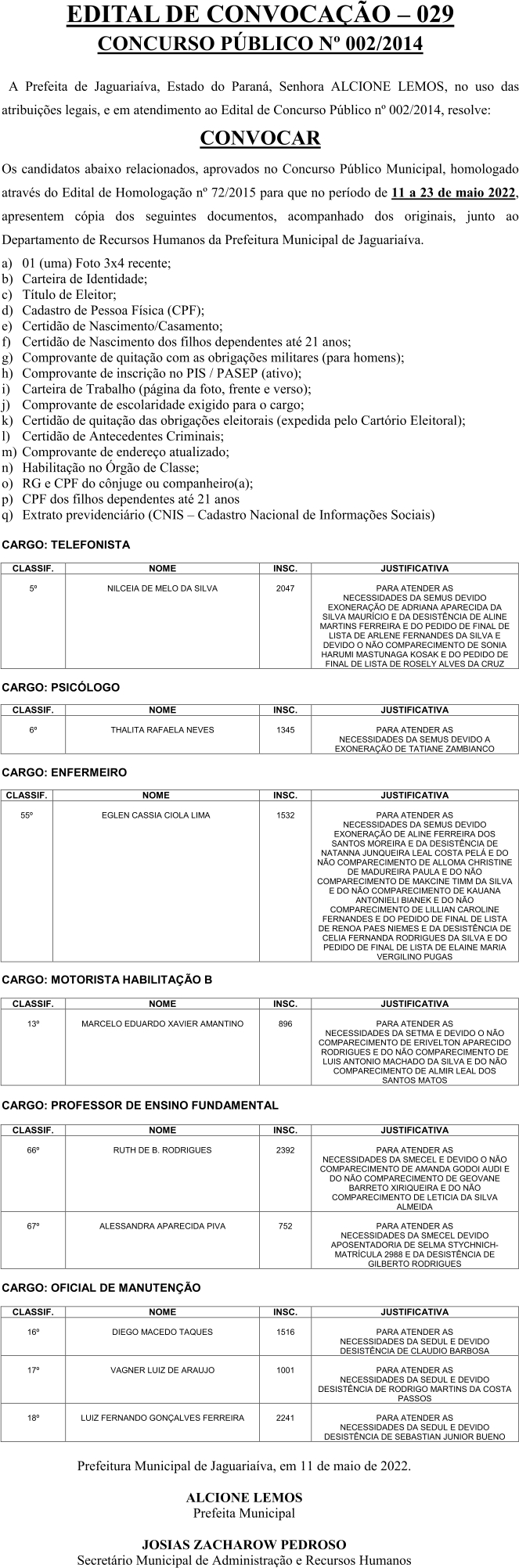 Edital de Convocação 029 – Concurso Público 002/2014