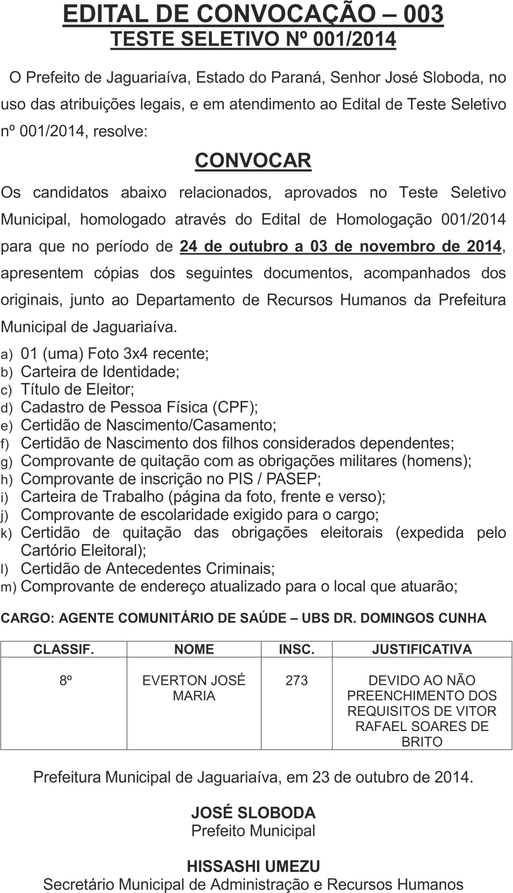 Edital de Convocação 03 – Teste Seletivo N° 001/2014