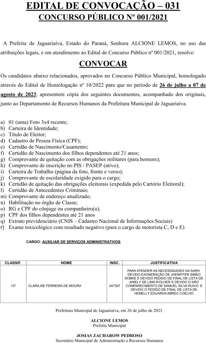 Edital de Convocação 031 – Concurso Público 001/2021
