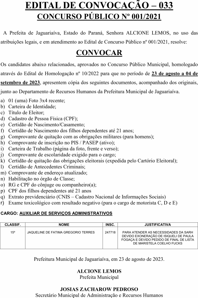 Edital de Convocação 033 – Concurso Público 001/2021