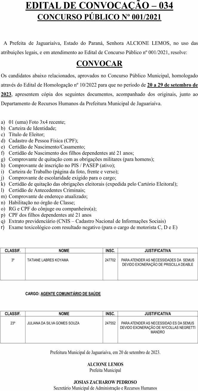 Edital de Convocação 034 – Concurso Público 001/2021