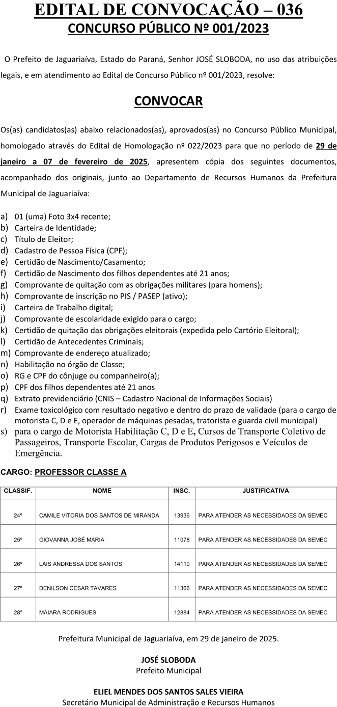 Edital de Convocação 036 – Concurso Público 001/2023