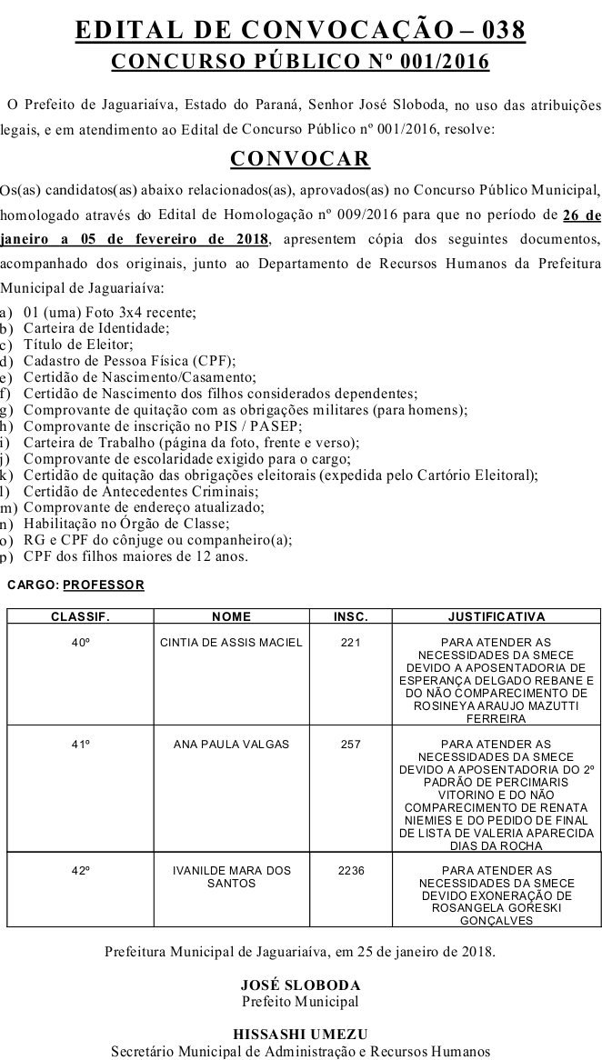 Edital de Convocação 038 – Concurso Público Nº 001/2016